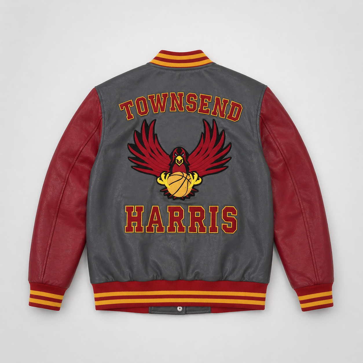 Crafted from premium genuine leather, the Townsend Legacy Varsity Jacket delivers a durable, smooth, and high-end finish. Featuring a structured leather body with contrasting sleeves, it offers long-lasting wear without compromising comfort. The jacket is detailed with high-quality embroidered patches and chenille lettering, ensuring bold design with strong stitching that won’t fade or peel. Finished with ribbed cuffs, collar, and hem, plus secure snap-button closure, this varsity jacket combines classic craftsmanship with standout durability.